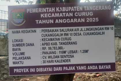 HARIANSINARPAGI.COM, TANGERANG | Proyek pembangunan turap saluran air di Desa Cukanggalih, Kecamatan Curug, Kabupaten Tangerang, kembali membuka borok lemahnya pengawasan pemerintah daerah. Pekerjaan senilai Rp99,7 juta yang digarap CV Wildan Sentosa melalui dana APBD 2025 ini diduga dikerjakan asal-asalan.