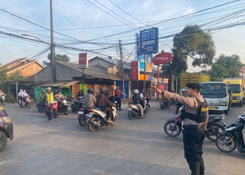 HARIANSINARPAGI.COM | Tangerang – Demi memastikan kelancaran arus kendaraan di jam padat pagi hari, anggota Unit Samapta Polsek Curug Polres Tangerang Selatan melaksanakan kegiatan Pengaturan Lalu Lintas (Gatur Lalin) di kawasan Perempatan Pondok Bambu, Jl. Raya STPI Curug, Kecamatan Curug, Kabupaten Tangerang, Selasa (14/10/2025) pukul 06.20 WIB.